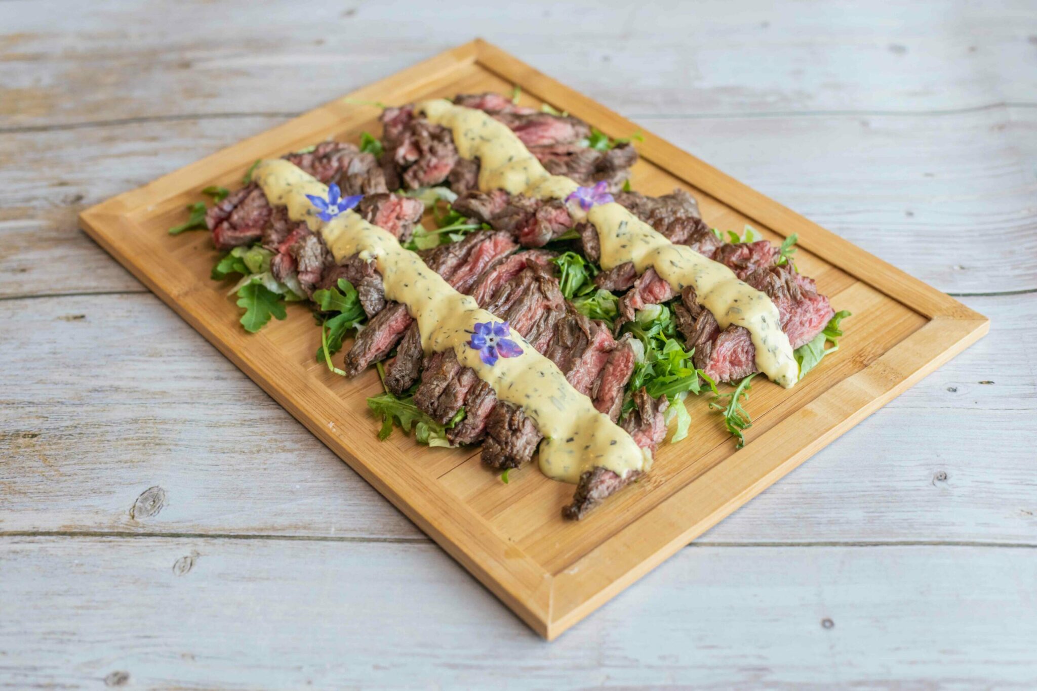 Planche de bavette grillée découpée en lamelle et sauce au poivre noir