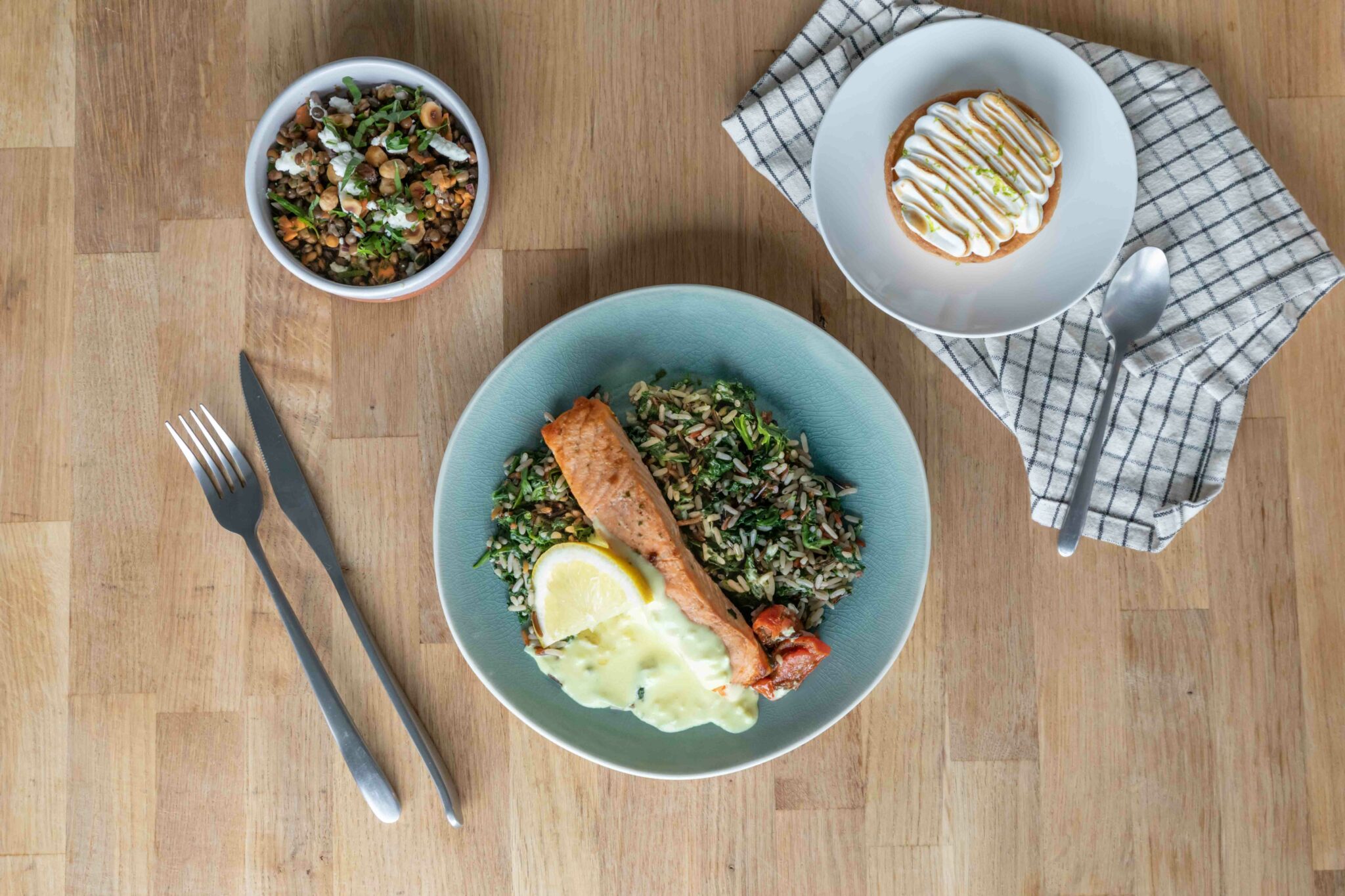 Plat : Saumon rôti, trio de riz, épinards, crème aux trois citrons